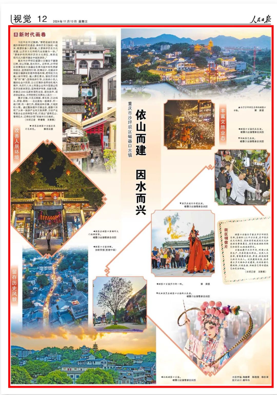 重慶市沙坪壩區(qū)磁器口古鎮(zhèn)位于嘉陵江畔,依山而建,因水而興。近年來,沙坪壩區(qū)統(tǒng)籌推動文旅融合發(fā)展與城市有機更新相結(jié)合,堅持規(guī)劃引領(lǐng)、統(tǒng)籌設(shè)計,在建設(shè)中保留古鎮(zhèn)原有肌理和街巷布局,把傳統(tǒng)文化融入城市街區(qū)、植入景區(qū)景點,留住歷史的“根”和“魂”;堅持政府引導(dǎo),以政府小投入撬動社會大投資、以公區(qū)微改造帶動私域大提升,先后引入本土民營企業(yè)和大型國企投資開發(fā)板塊項目;堅持保護傳承、創(chuàng)新發(fā)展,改善近2000名原有居民生活、居住條件,促進創(chuàng)業(yè)就業(yè),為傳統(tǒng)街區(qū)發(fā)展注入活力……