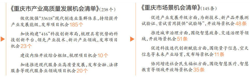 “這是一份重慶向全球企業(yè)發(fā)出的誠摯邀請。”市經(jīng)濟(jì)信息委相關(guān)負(fù)責(zé)人介紹,《重慶市產(chǎn)業(yè)高質(zhì)量發(fā)展機(jī)會清單》圍繞本地產(chǎn)業(yè)發(fā)展需求,從4個投資領(lǐng)域策劃招商項(xiàng)目238個、涉及總投資額近6300億元?!吨貞c市場景機(jī)會清單》則聚焦“產(chǎn)業(yè)發(fā)展、城市治理、科技迭代、社會民生”4個方面,共收集應(yīng)用場景機(jī)會145條。