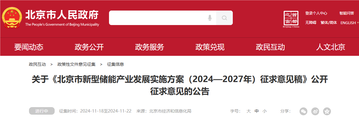 11月18日,北京市人民政府網(wǎng)發(fā)布關(guān)于《北京市新型儲(chǔ)能產(chǎn)業(yè)發(fā)展實(shí)施方案(2024—2027年)征求意見稿》(以下簡稱《實(shí)施方案》)公開征求意見的公告。其中,《實(shí)施方案》表示,支持光儲(chǔ)充檢、光儲(chǔ)充換、光儲(chǔ)直柔等新技術(shù)新模式示范推廣。
