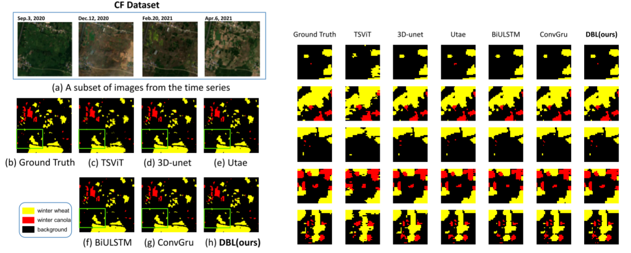 研究團(tuán)隊選取了中國長江流域兩個典型種植區(qū)域(安徽省長豐縣和湖北省荊門市),構(gòu)建了具有分散、不規(guī)則地塊特征的CF和JM時序遙感數(shù)據(jù)集,以評估DBL模型的性能。實驗結(jié)果顯示,DBL模型在CF數(shù)據(jù)集上的整體準(zhǔn)確率達(dá)到97.70%,相比現(xiàn)有方法,DBL在小型地塊的識別能力上實現(xiàn)了顯著提升,尤其是在分散、不規(guī)則的農(nóng)業(yè)地塊上展現(xiàn)出強(qiáng)大的魯棒性和精確性。此外,團(tuán)隊進(jìn)一步引入了小地塊識別指標(biāo),用于評估模型對330像素和165像素以下小地塊的識別效果,實驗結(jié)果證明該模型在復(fù)雜地塊環(huán)境中的識別優(yōu)勢。DBL模型在識別分散小型農(nóng)業(yè)地塊方面的突破,展現(xiàn)了其在亞洲復(fù)雜農(nóng)業(yè)環(huán)境中應(yīng)用的巨大潛力,有望應(yīng)用于作物健康監(jiān)測、種植模式分析以及農(nóng)業(yè)資源優(yōu)化等多個領(lǐng)域。