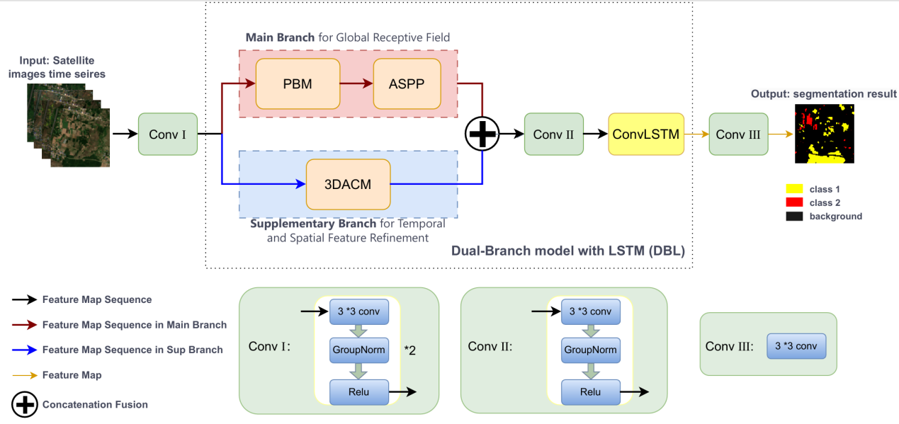 隨著大尺度遙感技術(shù)的快速發(fā)展,高分辨率衛(wèi)星影像數(shù)據(jù)為土地利用、農(nóng)業(yè)生產(chǎn)和環(huán)境監(jiān)測帶來了重大的技術(shù)變革和發(fā)展機(jī)遇。在人口稠密的亞洲大部分地區(qū),特別是中國,農(nóng)田種植表現(xiàn)為不規(guī)則、離散種植模式,農(nóng)作物種植類型和種植模式交錯復(fù)雜,與歐美地區(qū)的農(nóng)業(yè)模式存在顯著的差異,目前的傳統(tǒng)遙感圖像識別方法主要是針對歐美規(guī)?;N植模式,在應(yīng)對亞洲等不規(guī)則、離散復(fù)雜地塊結(jié)構(gòu)時難以取得高精度效果。因此,針對這些不規(guī)則小地塊的作物類型識別一直是一個重要的技術(shù)難題。為解決這一難題,研究團(tuán)隊設(shè)計了基于雙分支的DBL網(wǎng)絡(luò)。DBL網(wǎng)絡(luò)的主分支通過Pyramid Blend Module(PBM)擴(kuò)展感受野,獲取地塊的全局信息;輔助分支則利用新設(shè)計的三維注意力卷積模塊(3DACM)在時間和空間維度上提煉局部特征,從而增強(qiáng)了模型對小地塊的識別能力。通過這種雙分支結(jié)構(gòu),DBL在捕捉遙感圖像時序數(shù)據(jù)的動態(tài)變化方面表現(xiàn)出色。
