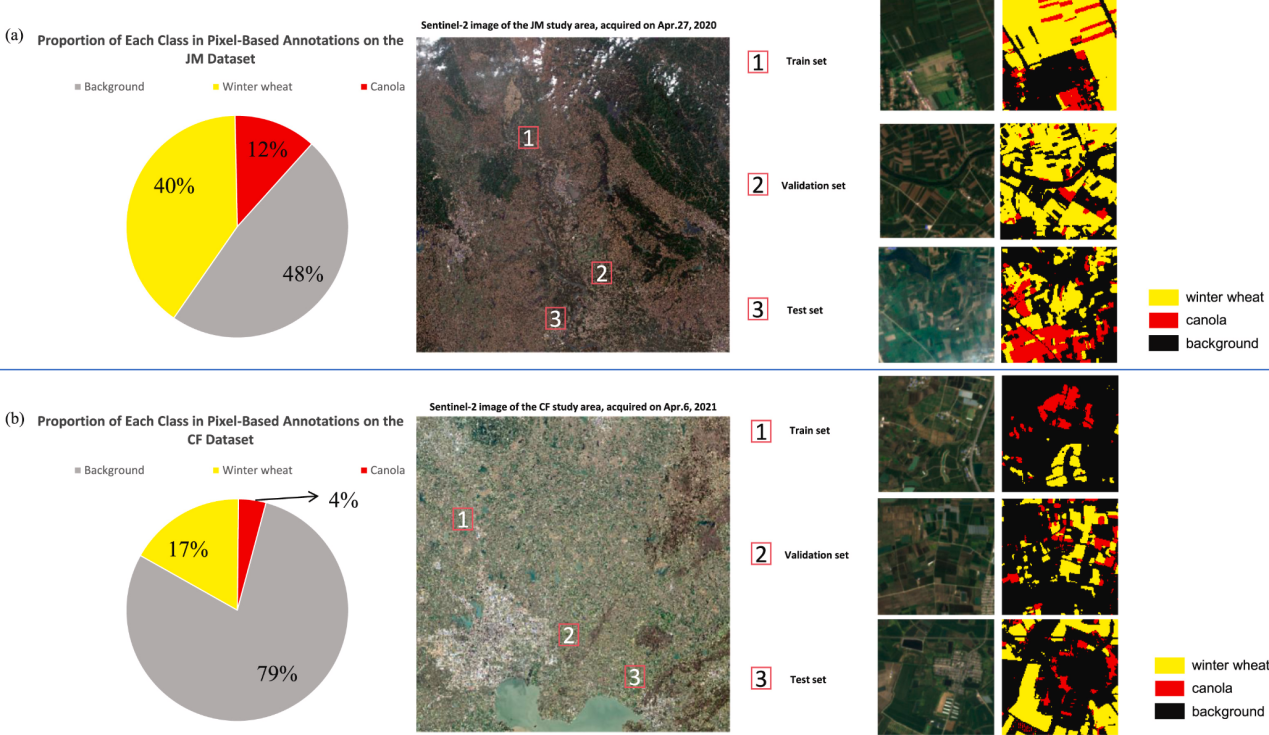 圖3研究區(qū)域的遙感影像概覽以及數(shù)據(jù)集樣本的統(tǒng)計分布情況
