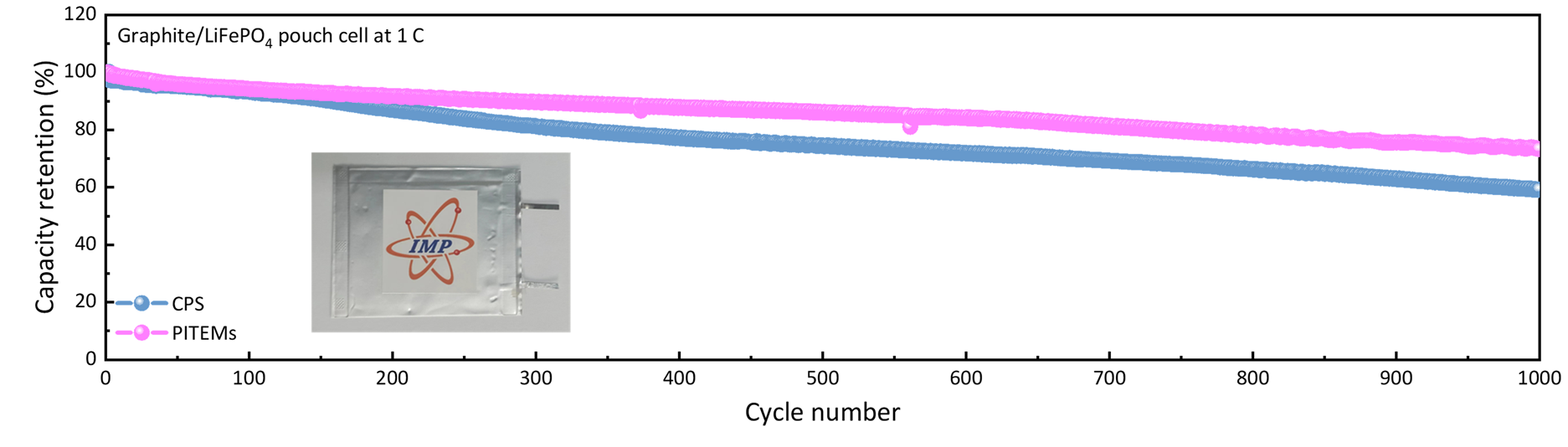 圖2 :磷酸鐵鋰軟包電池的長(zhǎng)循環(huán)性能對(duì)照