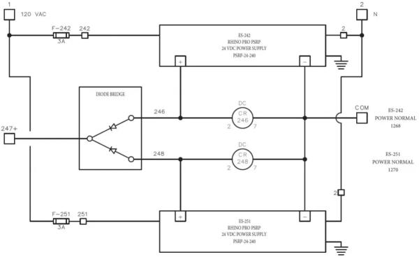 ▲圖1:由于電源是比較常見的故障來源,因此設(shè)計(jì)人員可以考慮通過二極管模塊實(shí)現(xiàn)雙電源組合。本文圖片來源:Automation Direct