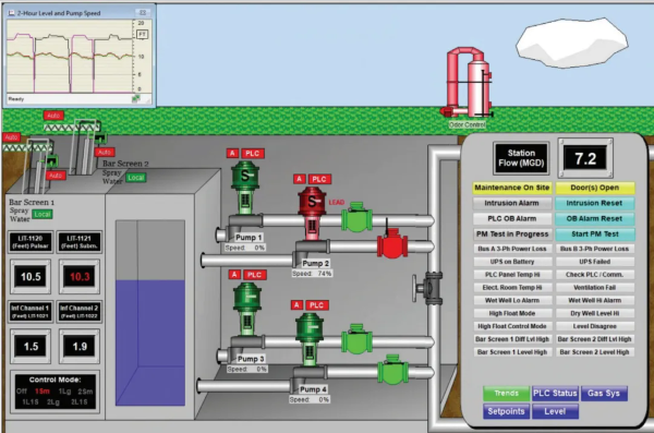 ▲圖:該HMI顯示的是一個(gè)廢水提升站,在“濕井”中使用兩種不同的液位測量技術(shù) (帶有“液位不一致” 報(bào)警)和四個(gè)冗余泵,所有這些都由被監(jiān)控的UPS供電。