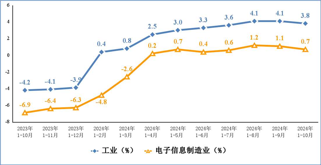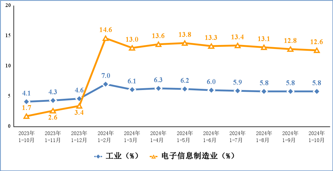 1-10月,規(guī)模以上電子信息制造業(yè)增加值同比增長12.6%,增速分別比同期工業(yè)、高技術(shù)制造業(yè)高6.8個和3.5個百分點。10月份,規(guī)模以上電子信息制造業(yè)增加值同比增長10.5%。