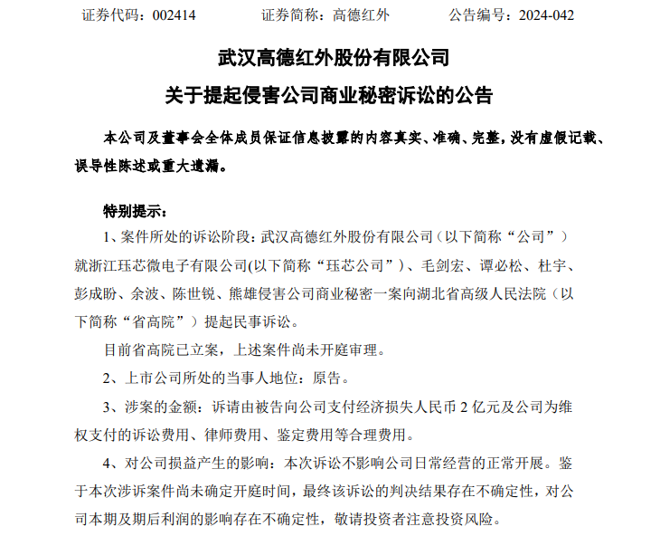 高德紅外在公告稱,湖北省高級人民法院已立案受理該案。同時為了保證經濟損失的有效收回,公司申請了財產保全,湖北省高級人民法院已出具民事裁定書,裁定查封、扣押、凍結玨芯公司、毛劍宏及公司六名前員工名下的銀行賬戶存款及理財產品、不動產等2億元。