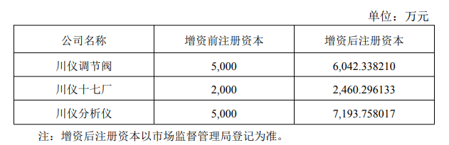 本次增資完成后,川儀調(diào)節(jié)閥、川儀十七廠、川儀分析儀仍為川儀股份全資子公司,注冊(cè)資本變更情況如下: