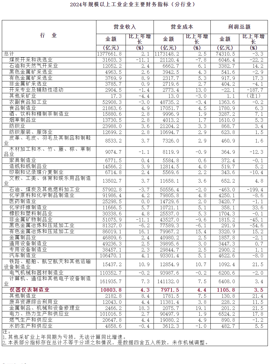 2025年1月27日,國家統(tǒng)計局公布了2024年全國規(guī)模以上工業(yè)企業(yè)實現(xiàn)利潤增長狀況。2024年,全國規(guī)模以上工業(yè)企業(yè)實現(xiàn)利潤總額74310.5億元,比上年下降3.3%。其中,2024年,全國規(guī)模以上儀器儀表制造企業(yè)實現(xiàn)利潤總額1105.8億元,同比增長3.5%。