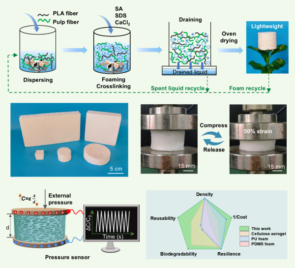 近日,中國科學(xué)院青島生物能源與過程研究所等在木質(zhì)纖維綠碳緩沖材料研發(fā)的基礎(chǔ)上,利用濕法發(fā)泡和離子交聯(lián)策略,將紙漿(Pulp)纖維和聚乳酸(PLA)纖維復(fù)合,構(gòu)筑出綠色、超彈新材料。這一材料可作為介電層,用于超彈壓力傳感和智能監(jiān)測等領(lǐng)域。