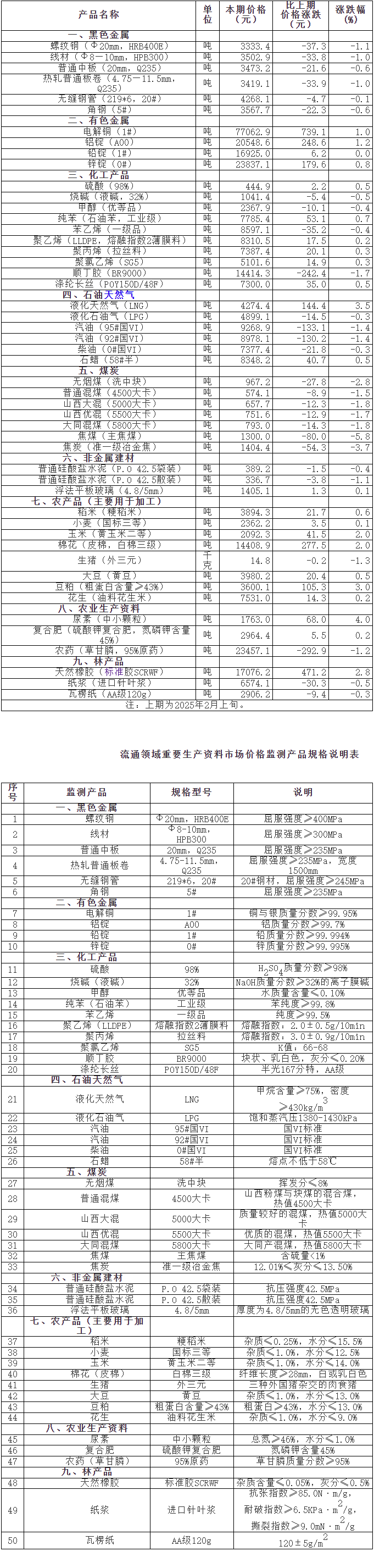 2025年2月中旬流通領(lǐng)域重要生產(chǎn)資料市場價(jià)格變動(dòng)情況