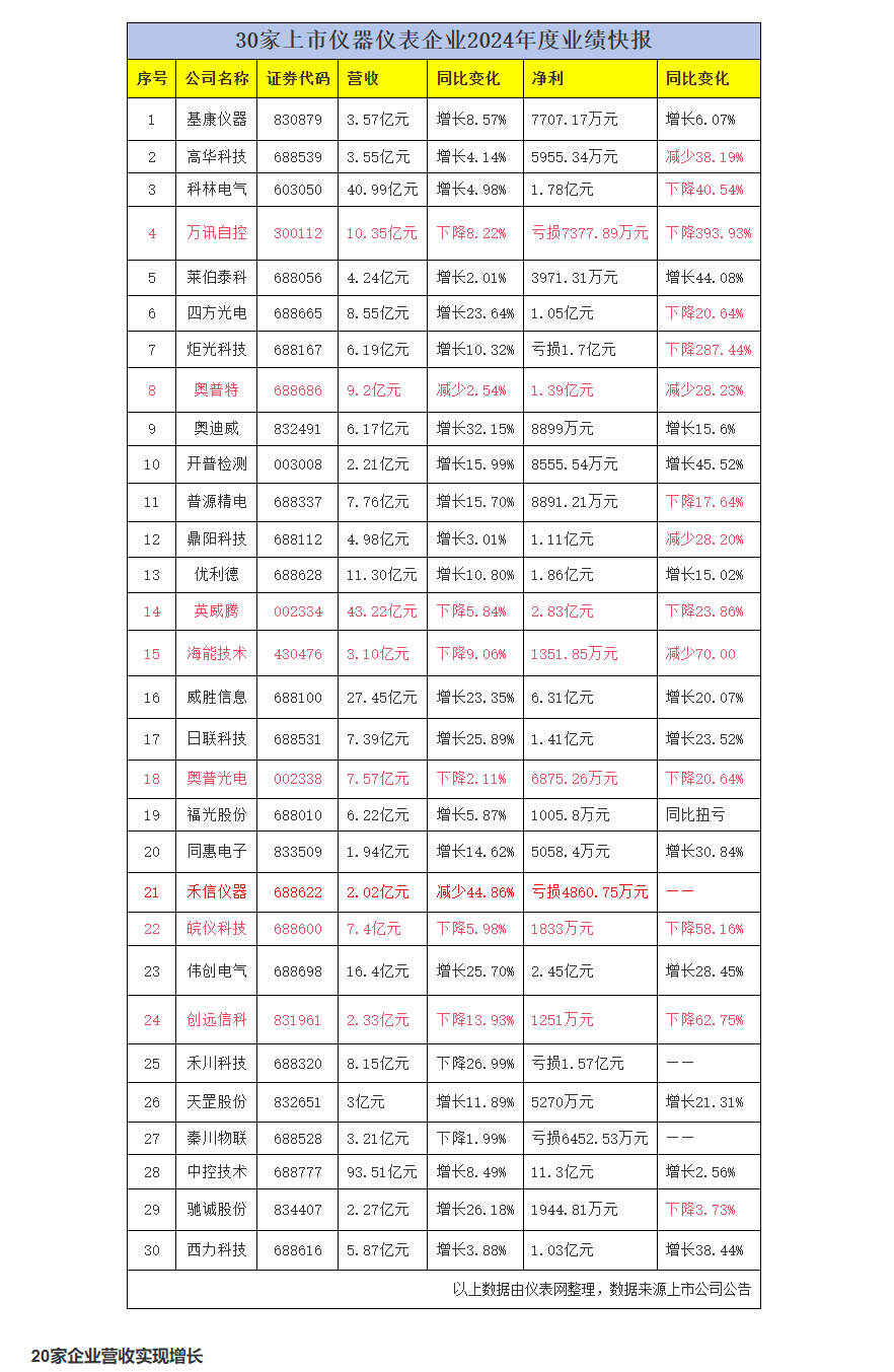 2024年上市公司業(yè)績快報的持續(xù)披露,為市場呈現(xiàn)了各行業(yè)的發(fā)展脈絡(luò)與企業(yè)的經(jīng)營成效。據(jù)儀表網(wǎng)統(tǒng)計,截至3月7日,已有30家上市儀器儀表企業(yè)披露了2024年業(yè)績快報,12家企業(yè)實(shí)現(xiàn)營收和凈利潤的雙增長,最高營收93.51億元,凈利潤11.3億元。