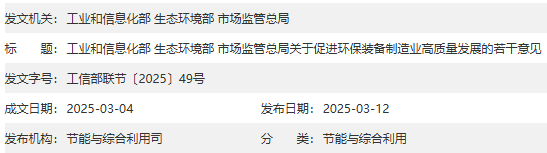 2025年3月4日,工業(yè)和信息化部、生態(tài)環(huán)境部、市場監(jiān)管總局聯(lián)合發(fā)布了《關(guān)于促進環(huán)保裝備制造業(yè)高質(zhì)量發(fā)展的若干意見》(工信部聯(lián)節(jié)〔2025〕49號),旨在推動環(huán)保裝備制造業(yè)的高質(zhì)量發(fā)展,鞏固提升環(huán)保裝備全產(chǎn)業(yè)鏈競爭優(yōu)勢,為美麗中國建設(shè)提供堅實的技術(shù)保障。
