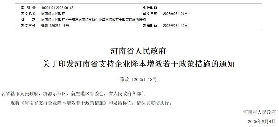 8月10日,河南省人民政府印發(fā)《河南省支持企業(yè)降本增效若干政策措施》(下稱(chēng)《措施》),推出20項(xiàng)具體舉措,從研發(fā)、轉(zhuǎn)型、人力、資金、用能、物流等十方面度降低企業(yè)經(jīng)營(yíng)成本。