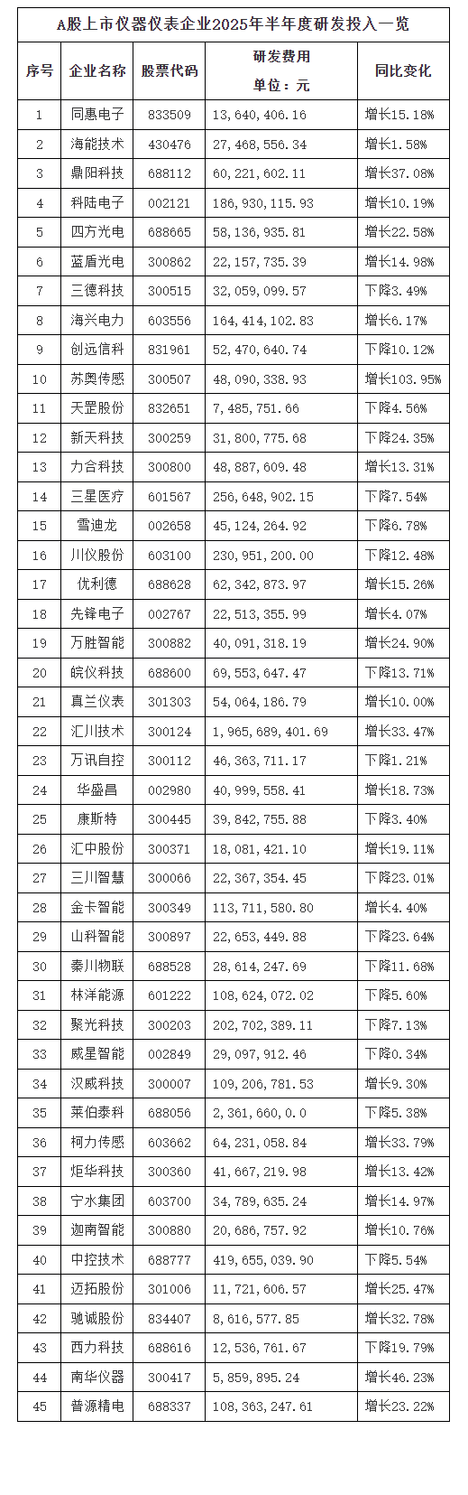 在此背景下,國(guó)內(nèi)儀器儀表企業(yè)對(duì)研究與開(kāi)發(fā)方面的投入愈發(fā)重視,不斷引入創(chuàng)新,提高自身技術(shù)先進(jìn)性以生產(chǎn)出具有競(jìng)爭(zhēng)力的高質(zhì)量產(chǎn)品,從而在這場(chǎng)發(fā)展機(jī)遇中占據(jù)有利地位。2025年上半年,哪些上市儀器儀表企業(yè)最重視研發(fā)投入、投入的研發(fā)資金最多?