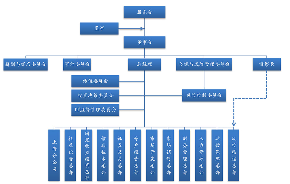 公司董事會下設(shè)薪酬與提名委員會、審計(jì)委員會、合規(guī)與風(fēng)險(xiǎn)管理委員會,總經(jīng)理根據(jù)董事會的授權(quán),主持公司的日常經(jīng)營管理工作。公司下設(shè)固定收益投資總部、權(quán)益投資總部、市場開發(fā)總部、市場銷售總部、專戶投資總部、風(fēng)控稽核總部、運(yùn)營保障總部、人力資源總部、證券交易總部等職能部門。