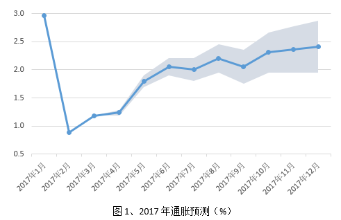 我們根據(jù)過(guò)去幾年CPI環(huán)比數(shù)據(jù)估算了2017年各月環(huán)比數(shù)據(jù),為了體現(xiàn)石油價(jià)格、食品價(jià)格可能的意外影響,從4月份起在各月環(huán)比數(shù)據(jù)上加減0.05個(gè)百分點(diǎn)。從而得到一個(gè)區(qū)間。從圖1來(lái)看,今年CPI不會(huì)超過(guò)政策目標(biāo)。