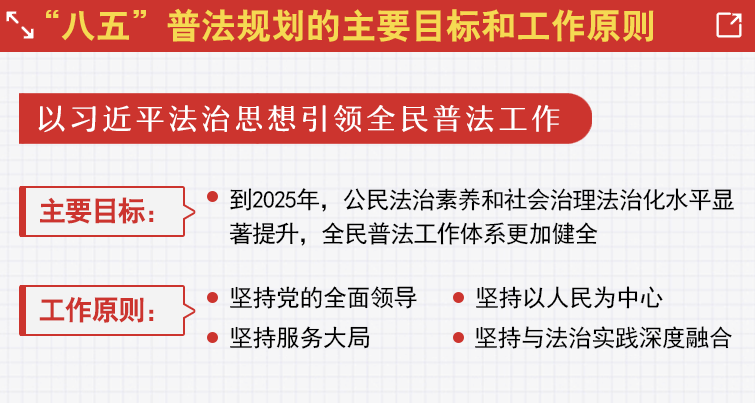 到2025年,法治中國首善之區(qū)建設邁出新步伐,黨對守法普法工作的領導全面加強。守法普法工作取得長足發(fā)展,全社會大普法格局進一步鞏固完善,法治宣傳教育工作的針對性實效性進一步增強,社會主義法治文化進一步繁榮,社會主義法治精神進一步弘揚,社會治理法治化水平進一步提升。公民的法治素養(yǎng)顯著提升,尊法學法守法用法的自覺性和主動性不斷增強,辦事依法、遇事找法、解決問題用法、化解矛盾靠法成為普遍共識。全民普法制度完備、實施精準、評價科學、責任落實的工作體系基本形成。