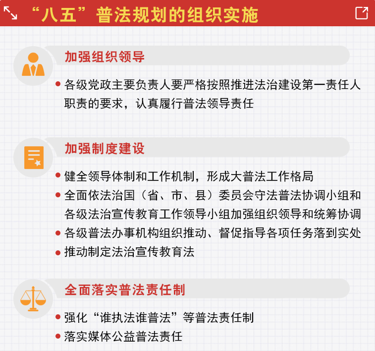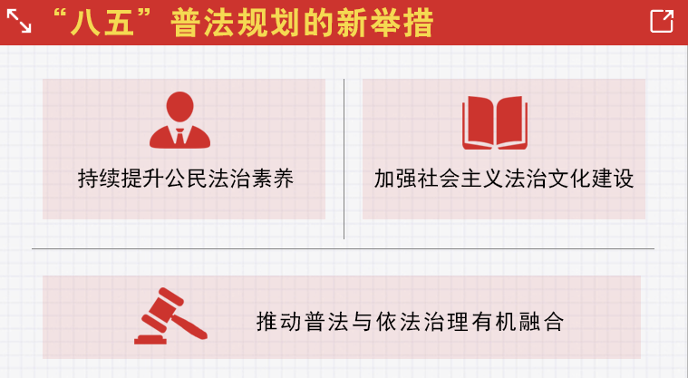 ?。ㄎ澹┩七M法治宣傳教育創(chuàng)新。順應時代發(fā)展新要求,在宣傳法律體系和法律制度的同時,更加注重服務經濟社會發(fā)展和滿足人民群眾的實際需求,更加注重培育法治理念,更加注重培養(yǎng)運用法治思維、法治方式的能力,努力實現法治宣傳教育重點向增強公民法治觀念、培育公民法治信仰轉變。發(fā)揮人民團體、社會組織、行業(yè)協會在普法工作中的積極作用,鞏固發(fā)展社會普法大格局。強化品牌效應,繼續(xù)深化“法律十進”“普法聯盟”工作。大力推進“智慧普法”行動,實現法治宣傳教育公共數據資源開放共享。建設融“報、網、端、微、屏”于一體的全媒體法治傳播體系,靈活運用新技術新手段,擴大法治宣傳教育覆蓋面。