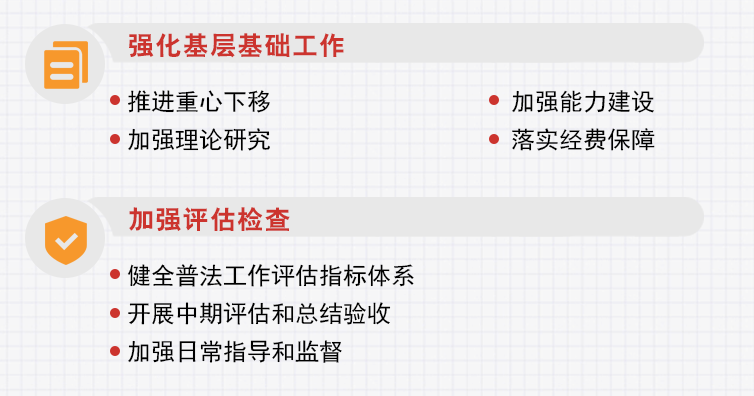 ?。娀鶎踊A和保障工作。認真開展規(guī)劃實施中期評估和總結驗收。落實經費保障,各區(qū)要將法治宣傳教育經費納入本級財政預算,加強對經費管理、監(jiān)督,做好績效評價工作。各部門各單位要根據普法工作任務,安排相應普法專項經費。加強基層建設,強化政策、制度、機制保障,從人員配備數量、待遇、經費、裝備等方面,切實向普法基層一線傾斜,將具有法律職業(yè)資格的人員充實到普法工作一線,為基層開展普法和依法治理創(chuàng)造更好條件。