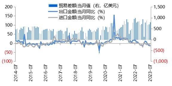 7月按美元計價的出口同比增速,從6月的-12.4%降至-14.5%,同期進(jìn)口同比增速也從-6.8%降至-12.4%。進(jìn)、出口數(shù)據(jù)雙雙弱于市場預(yù)期(出口預(yù)期-13.2%;進(jìn)口預(yù)期-5.6%)。7月貿(mào)易順差從6月的706億元美元擴(kuò)大至806億元美元,小幅擴(kuò)大。進(jìn)出口數(shù)據(jù)走弱的背后,反映出內(nèi)、外需雙弱以及產(chǎn)業(yè)鏈外遷帶來的進(jìn)出口需求雙下降。