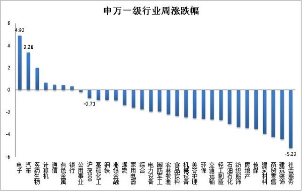 1. 上周行情概覽:滬深300指數(shù)下跌0.71%。汽車行業(yè)指數(shù)上漲3.38%,漲幅大于滬深300指數(shù),在申萬31個一級行業(yè)中,位列第2位。電子行業(yè)指數(shù)上漲4.90%,漲幅最高,社會服務(wù)行業(yè)指數(shù)下跌5.23%,跌幅最大。