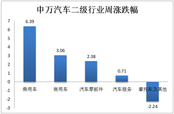 2. 汽車行業(yè)二級子板塊:乘用車上漲6.39%,漲幅最大;摩托車及其他下跌2.24%,跌幅最大。