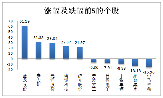 3. 個股漲跌:汽車板塊內(nèi)共有251只個股,上周個股漲多跌少,其中174只個股上漲,74只個股下跌。漲跌幅均值為3.16%,中值為2.07%。漲幅最大的個股是:圣龍股份(61.19%);跌幅最大的個股是:中馬傳動(-15.96%)。