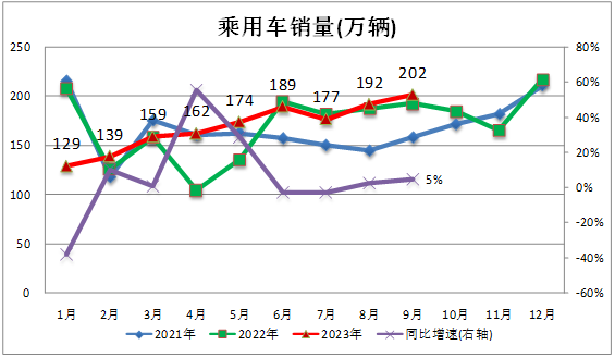 2023年9月乘用車市場零售達到201.8萬輛,同比增長5.0%,環(huán)比增長5.0%。今年以來累計零售1523.3萬輛,同比增長2.4%。(數(shù)據(jù)來源:中汽協(xié))
