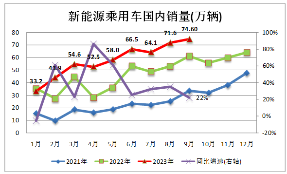 9月新能源車市場零售74.6萬輛,同比增長22.1%,環(huán)比增長4.2%。今年以來累計零售518.8萬輛,同比增長33.8%。(數(shù)據(jù)來源:中汽協(xié))
