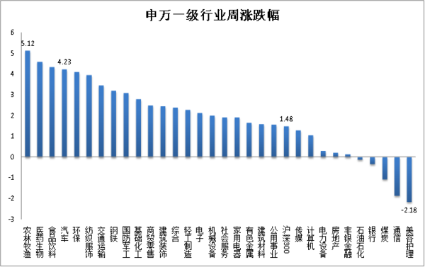 1. 上周行情概覽:滬深300指數(shù)上漲1.48%。汽車行業(yè)指數(shù)上漲4.23%,漲幅小于滬深300指數(shù),在申萬31個一級行業(yè)中,位列第4位農(nóng)林牧漁指數(shù)上漲5.12%,跌幅最小,美容護(hù)理指數(shù)下跌7.35%,跌幅最大。