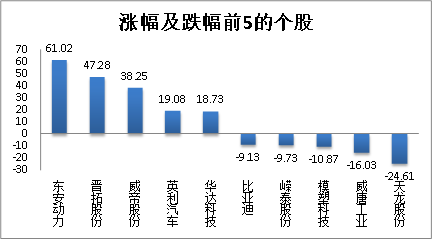 3. 個(gè)股漲跌:汽車板塊內(nèi)共有251只個(gè)股,上周個(gè)股漲多跌少,其中141只個(gè)股上漲,106只個(gè)股下跌。漲跌幅均值為1.20%,中值為0.51%。漲幅最大的個(gè)股是:東安動(dòng)力(61.02%);跌幅最大的個(gè)股是:天龍股份(-24.61%)。