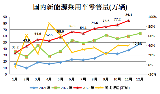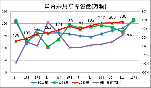 根據(jù)中汽協(xié)數(shù)據(jù),2023年11月,我國乘用車市場零售208萬輛,同比增長26.1%,環(huán)比增長2.4%;今年累計(jì)零售1934.5萬輛,同比增長5.3%。
