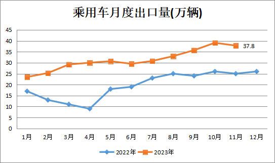 出口方面,11月我國乘用車出口37.8萬輛,同比增加51.2%,環(huán)比降低3.3%;今年累計(jì)出口344.6萬輛,同比增長64.1%。