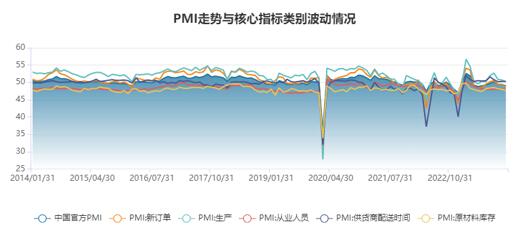 從行業(yè)上看,處于景氣度區(qū)間的行業(yè)數(shù)量平穩(wěn),原材料加工業(yè)漲跌不一,中下游制造業(yè)景氣度較低。其中環(huán)比上升幅度較大的分別是:紡織服裝服飾業(yè)、化學原料及化學制品制造業(yè)、化學纖維及橡膠塑料制品業(yè),PMI分別為58.4、49.2、49.5,環(huán)比上升16.3、2.7、1.1。石化行業(yè)中的,化學原料與化纖PMI均上升,化學原料PMI為49.2,化纖PMI為49.5,其中化學原料環(huán)比上升2.7,化纖環(huán)比上升1.1。下降的行業(yè):汽車制造業(yè)、專用設備制造業(yè)、通用設備制造業(yè)環(huán)比下降,電氣機械及器材制造業(yè)與上月持平;原材料加工行業(yè)中黑色和石油的PMI下行,黑色PMI為46,環(huán)比下降2.2,石油PMI為36.9,環(huán)比下降4。下游的醫(yī)藥制造業(yè)PMI為56.8,環(huán)比下降1.2,紡織服裝業(yè)PMI為58.4,環(huán)比上升16.3。