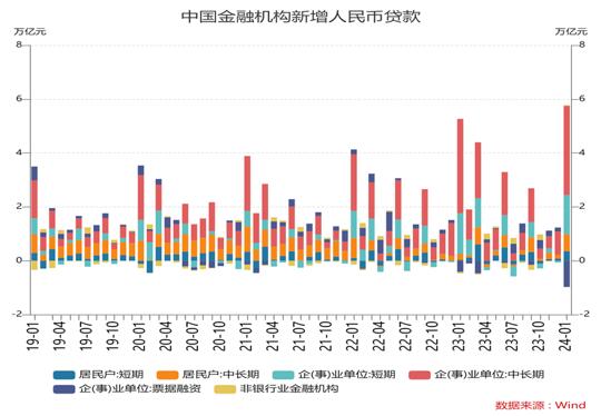 分項看,1月企業(yè)貸款新增3.86萬億元,同比少增8200億元。其中,企業(yè)中長期貸款新增3.31萬億元,23年天量基數(shù)(3.5萬億元)影響下,雖然同比少增1900億元,橫向來看遠(yuǎn)超歷年同期,大概率與年初企業(yè)信貸需求集中釋放,以及增發(fā)國債、城中村改造等配套融資需求增加有關(guān)。短期融資方面:短期貸款新增1.46萬億元,同比少增500億元;票據(jù)融資減少9733億元,同比多減5605億元,中長期貸款高增,票據(jù)沖量訴求回落,票據(jù)融資拖累較多。居民貸款方面,受低基數(shù)影響,中長期貸款有所改善。1月居民貸款新增9801億元,同比多增7229億元,短期及長期貸款均有貢獻(xiàn)。其中,短期貸款新增3528億元,同比多增3187億元;中長期貸款新增6272億元,同比多增4041億元,絕對量與歷年同期均值的差距也逐步縮小??梢姡M管30城新房銷售環(huán)比仍弱于季節(jié)性,但部分城市二手房成交面積環(huán)比強(qiáng)于季節(jié)性,是中長期貸款改善的主要原因。