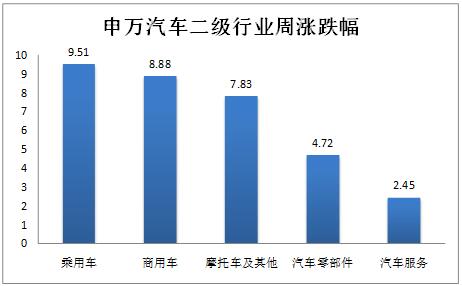 2.汽車行業(yè)二級子板塊:乘用車板塊上漲9.51%,漲幅最大;汽車服務(wù)板塊上漲2.45%,漲幅最小。