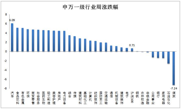 上周行情概覽:滬深300指數(shù)上漲0.71%。汽車行業(yè)指數(shù)上漲6.09%,漲幅大于滬深300指數(shù),在申萬31個一級行業(yè)中位列第1位。煤炭行業(yè)指數(shù)下跌7.24%,跌幅最大。