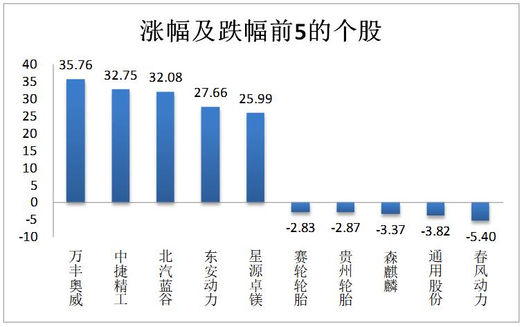 個股漲跌:汽車板塊個股上周漲多跌少,其中230只個股上漲,20只個股下跌。漲跌幅均值為7.84%,中值為6.88%。漲幅最大的個股是:萬豐奧威(35.76%);跌幅最大的個股是:春風動力(-5.40%)。