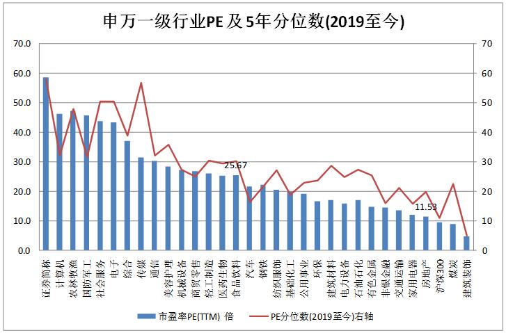圖表 10 申萬一級行業(yè)PE及5年分位數(shù)(%)