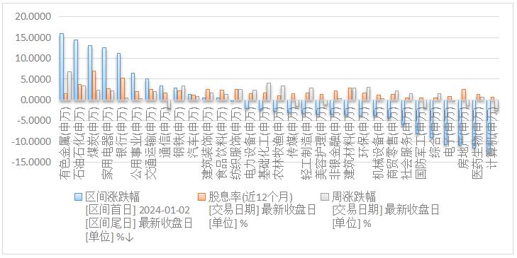 圖表1:區(qū)間漲跌幅(%)和股息率(%)(申萬(wàn)一級(jí)行業(yè)指數(shù))