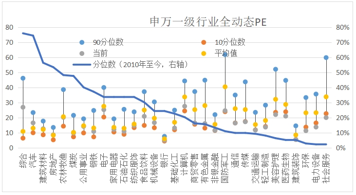 圖表2:A股行業(yè)估值情況(申萬(wàn)以及行業(yè)PE(TTM))
