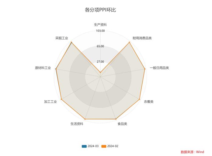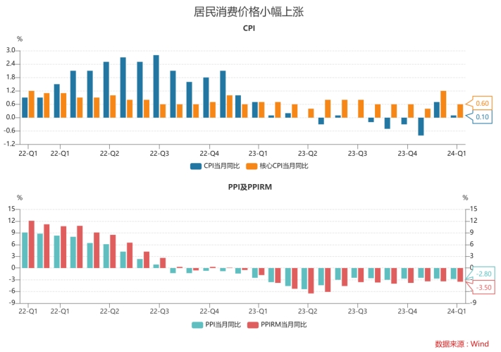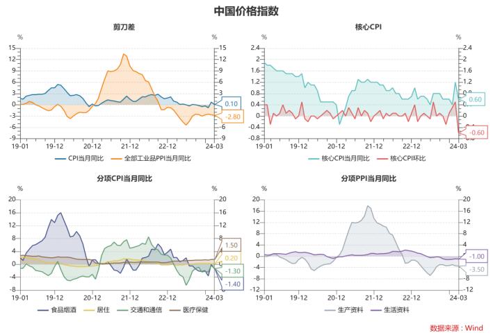 3月CPI同比0.1%(前值0.7%),預(yù)期0.3%,環(huán)比-1.0%(前值1.0%);PPI同比-2.8%(前值-2.7%),預(yù)期-2.7%,環(huán)比-0.1%(前值-0.2%)。