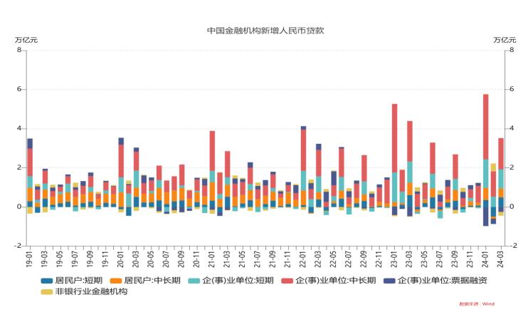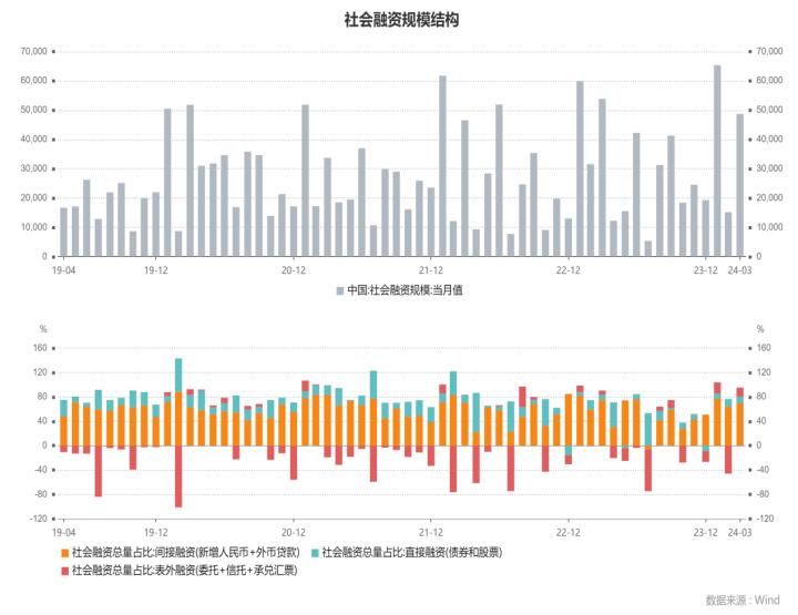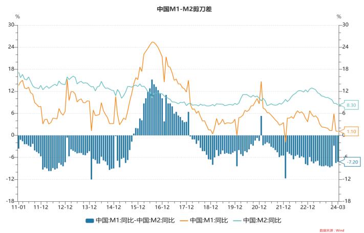 2024年3月新增人民幣貸款3.09萬億,預(yù)期3.03萬億,2023年同期3.89萬億;新增社融4.87萬億,預(yù)期4.11萬億,去年同期5.39萬億;存量社融增速8.7%,前值9.0%;M2同比8.3%,預(yù)期8.4%,前值8.7%;M1同比1.1%,前值1.2%。