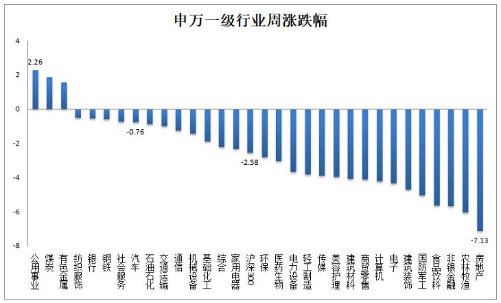上周市場總體呈小幅下跌走勢。從行業(yè)表現(xiàn)看,僅有公用事業(yè)(+2.26%)、煤炭(+1.86%)和有色金屬(+1.56%)錄得正收益。跌幅靠前的行業(yè)分別是:房地產(chǎn)(-7.13%)、農(nóng)業(yè)(-6.05%)、非銀(-5.70%)、食品飲料(-5.66%)和軍工(-5.05%)。