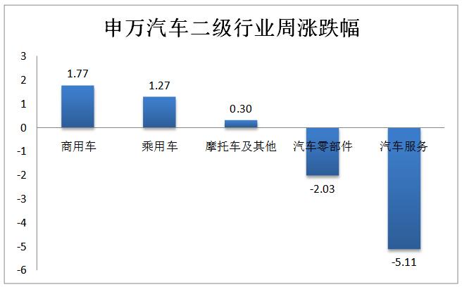 2、汽車行業(yè)二級子板塊:商用車板塊上漲1.77%,漲幅最大;汽車服務(wù)板塊下跌5.11%,跌幅最大。