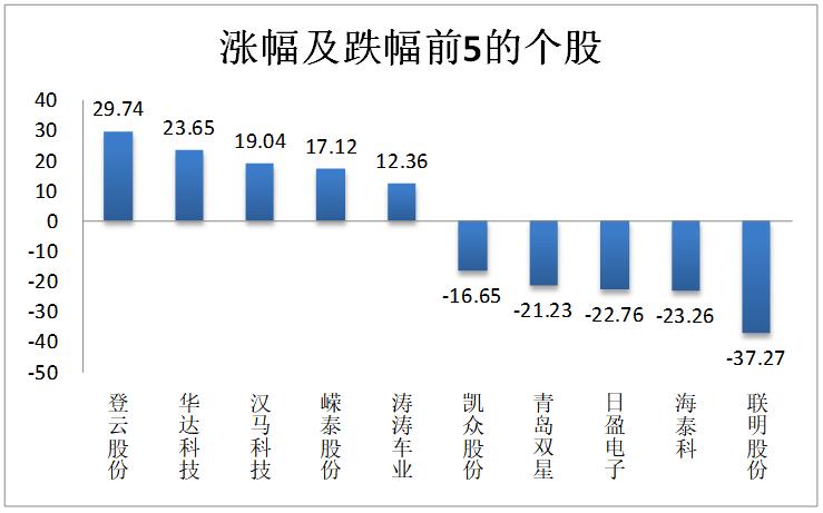 3、個股漲跌:汽車板塊個股上周漲少跌多,其中46只個股上漲,205只個股下跌。漲跌幅均值為-3.46%,中值為-3.84%。漲幅最大的個股是:登云股份(29.74%);跌幅最大的個股是:聯(lián)明股份(-37.27%)。