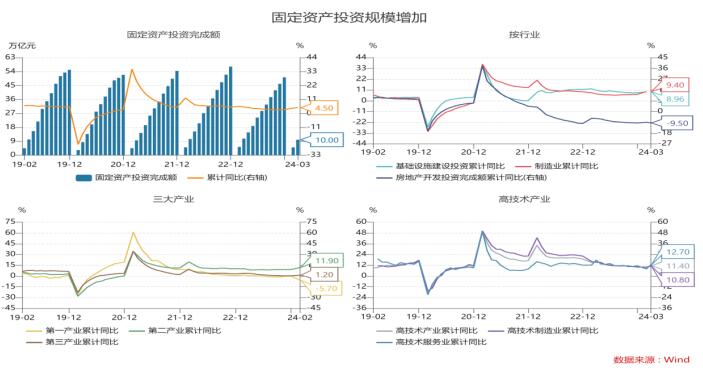 1-3月固投同比增長4.5%(前值4.2%),預(yù)期4.4%,地產(chǎn)投資同比增長-9.5%(前值-9%),預(yù)期-9%,狹義基建投資同比增長6.5%(前值6.3%),廣義基建8.8%,預(yù)期7.8%,前值9.0%,制造業(yè)投資同比增長9.9%(前值9.4%),預(yù)期8.9%。