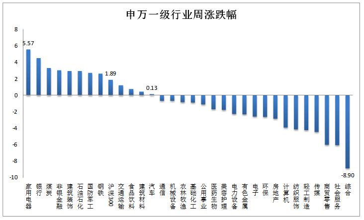 上周市場總體呈小幅上漲走勢,大小盤分化明顯,大盤價值上漲,中小盤總體下跌。從行業(yè)表現(xiàn)看,家電(+5.57%)、銀行(+4.48%)、煤炭(+3.29%)、非銀金融(3.04%)、建筑裝飾(+2.94%)、石油石化(+2.94%)、國防軍工(+2.74%)漲幅靠前,跌幅靠前的板塊分別為綜合(-8.89%)、社服(-6.09%)、商貿(mào)零售(-6.01%)、傳媒(-4.48%)、輕工(-4.23%)、紡服(-4.14%)、計算(-3.93%)、房地產(chǎn)(-2.87%)。